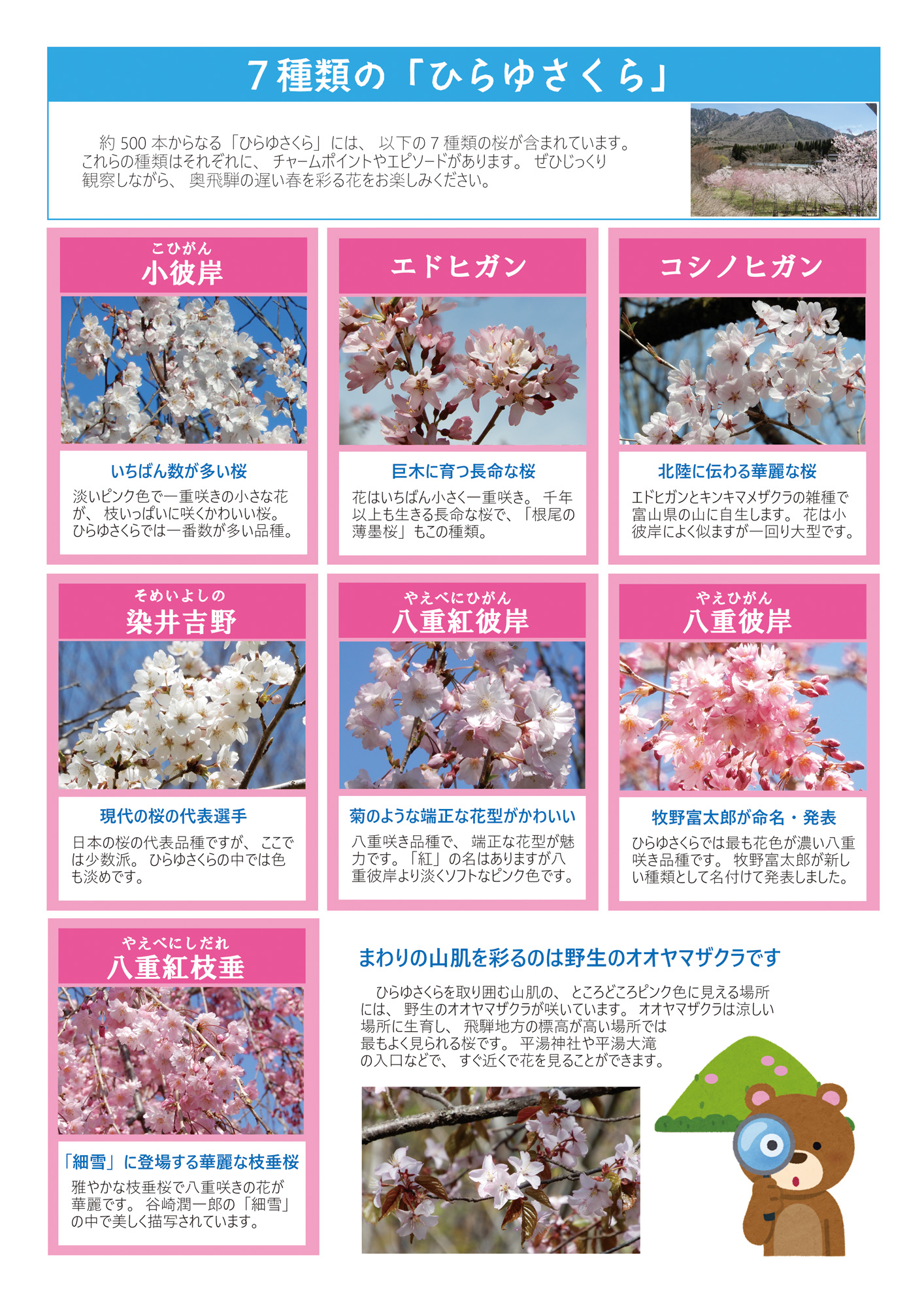 北アルプスの山麓に位置し、5つの温泉地が点在する奥飛騨温泉郷の桜は、平地の約1ヶ月後、4月下旬頃から開花します。中でも、隠れた桜の名所「ひらゆさくら」では、約500本もの優美な桜と飛騨高山の山嶺が美しいコントラストを織りなします。また、奥飛騨温泉郷の玄関口としてアクセスも良好で、山岳観光拠点として人気のエリアですので、春の暮れのお出かけにゆっくりと訪れる桜と名湯をお楽しみください。